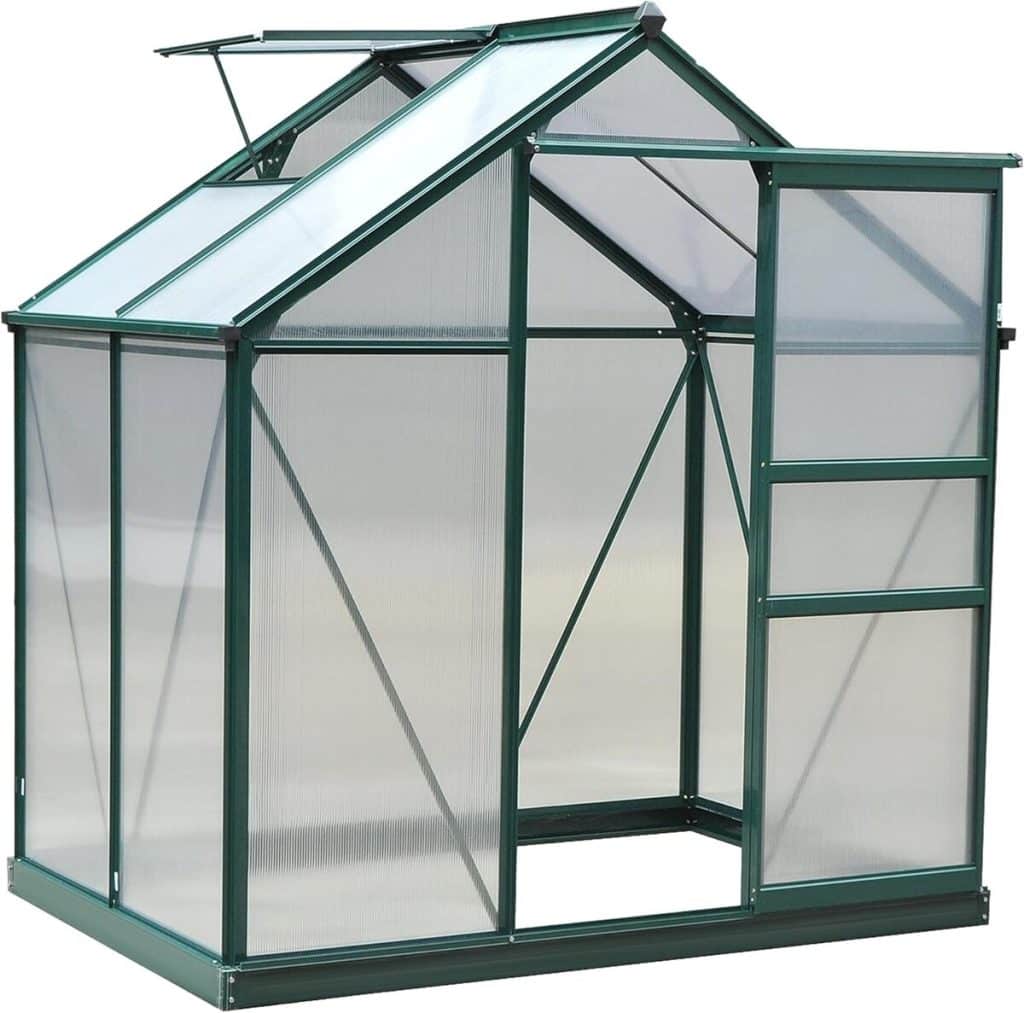 Outsunny Serre de Jardin Polycarbonate 2,51 m² Serre en Aluminium pour Le Jardin 190 x 132 x 201 cm résistant aux UV, avec Fondation renforcé, gouttière, Lucarne et Porte Coulissant, Vert foncéSERRE DE JARDIN ROBUSTE POUR L'EXTÉRIEUR : Garder une serre de jardin à l'extérieur vous permet de garder votre pelle dans le sol toute l'année. Que vous souhaitiez faire pousser des semis ou des plantes tropicales, notre kit de serre en polycarbonate offre une protection contre le froid, le vent, la pluie et les animaux sauvages SERRE DE JARDIN EN POLYCARBONATE : En augmentant l'humidité avec une isolation supérieure, les panneaux transparents en polycarbonate rendent notre serre prête pour les conditions extérieures. Ils laissent passer une lumière nourrissante tout en bloquant les rayons UV brûlants LUCARNE SUR LE TOIT : Laissez la chaleur et l'humidité en excès s'échapper lentement vers l'extérieur afin d'obtenir des conditions de croissance optimales. Contrôlez l'air à l'intérieur grâce à la ventilation articulée située sur le dessus de votre serre extérieure PORTE COULISSANTE : Une porte coulissante vous permet de faire entrer facilement des plantes, des outils et d'autres équipements dans votre serre de jardin extérieure. Ouvrez-la pour évacuer l'air vicié, ou fermez-la rapidement pour maintenir une barrière extérieure solide RÉSISTANT À L'EAU : L'aluminium revêtu de poudre confère à notre serre extérieure une construction résistante à l'eau qui est facile à assembler. Une fondation en acier galvanisé renforce la structure pour plus de solidité. Les gouttières aident à collecter l'eau de pluie naturelle. Remarque : Nous recommandons de la placer contre un mur et à l'abri du vent